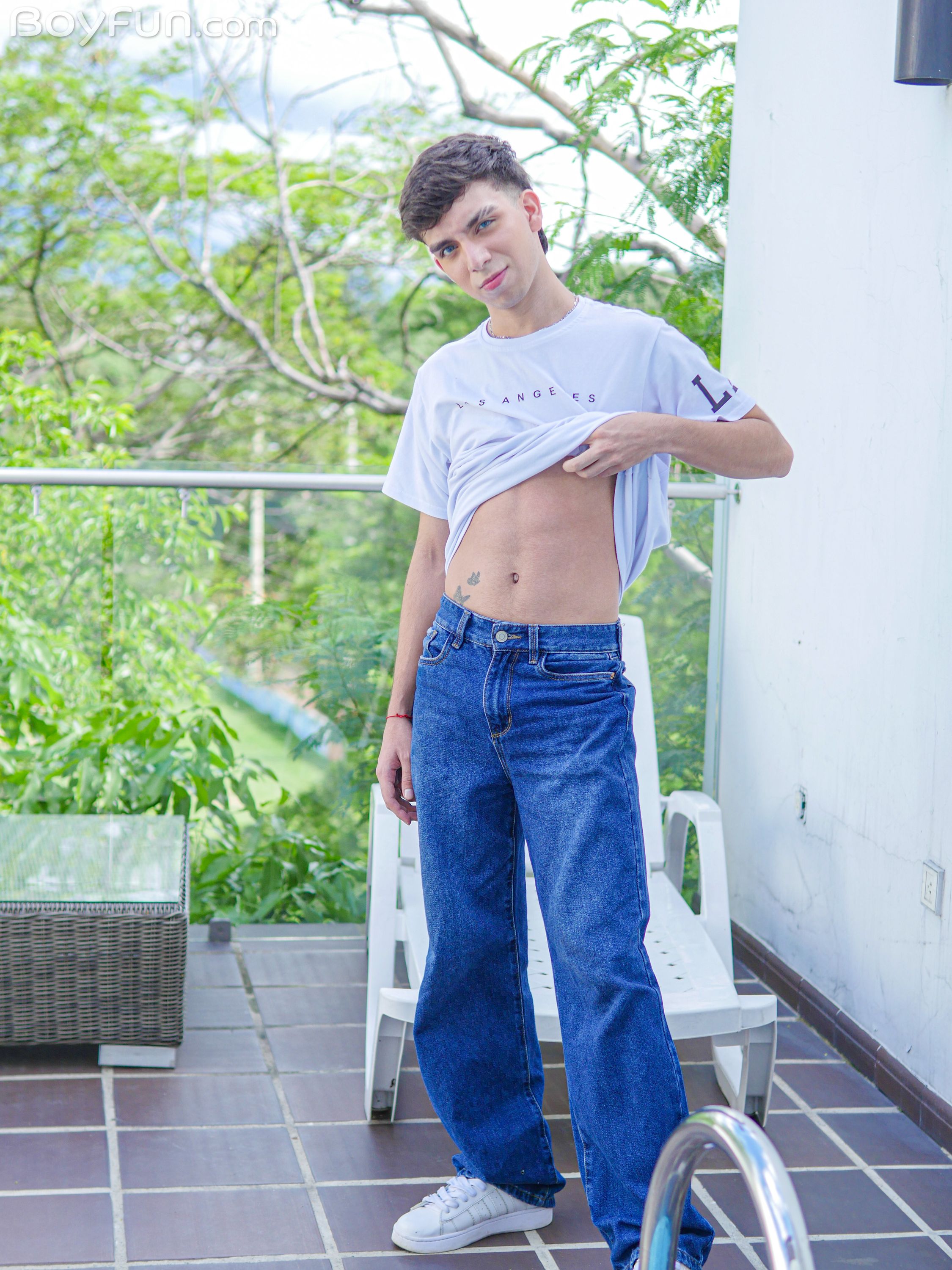 Liam Zuares latino magro sega l'uccello grosso non circonciso in giardino: foreskin che scivola, sega lenta e veloce fino alla sborrata abbondante. Twink latino da leccare!