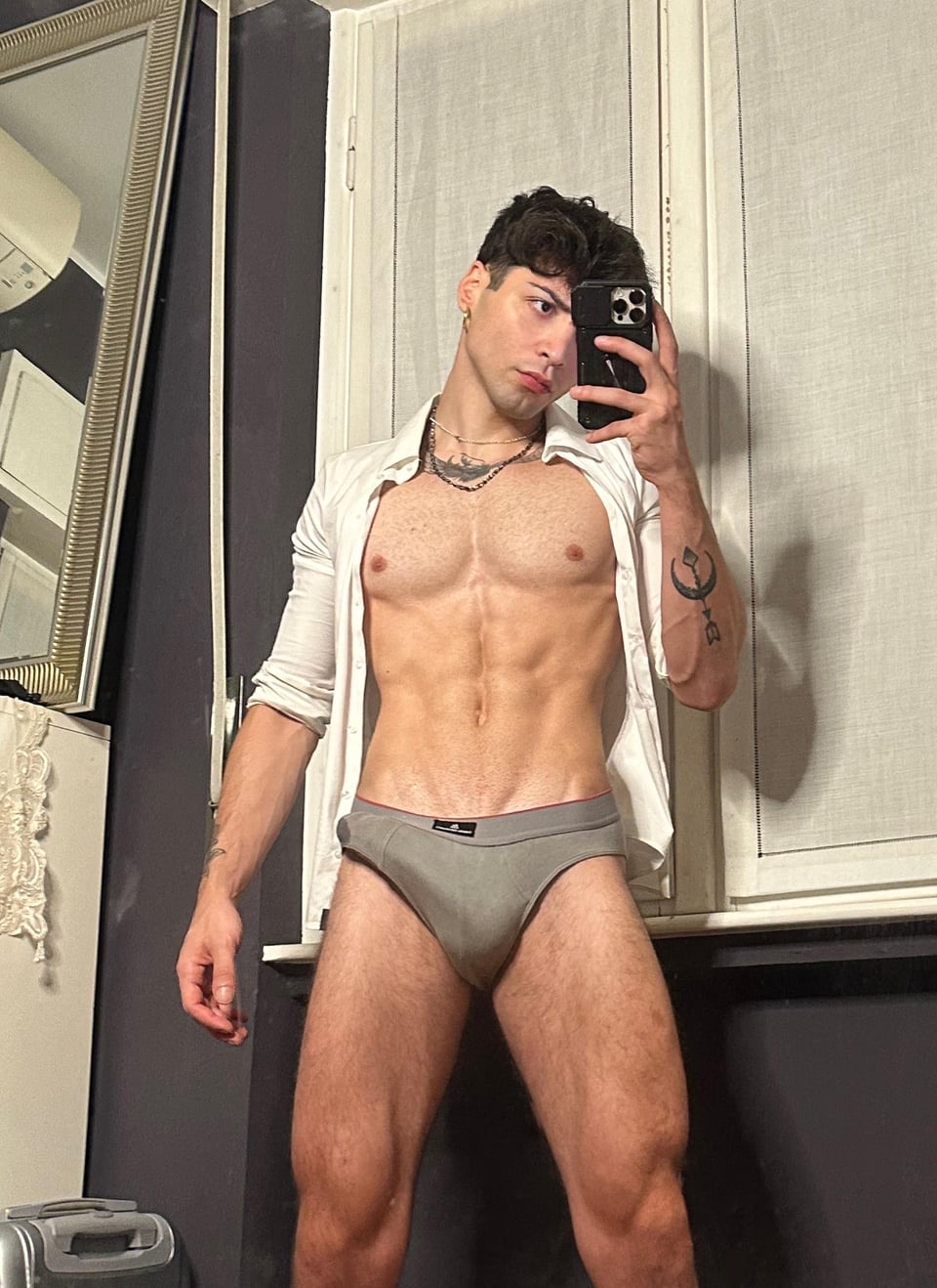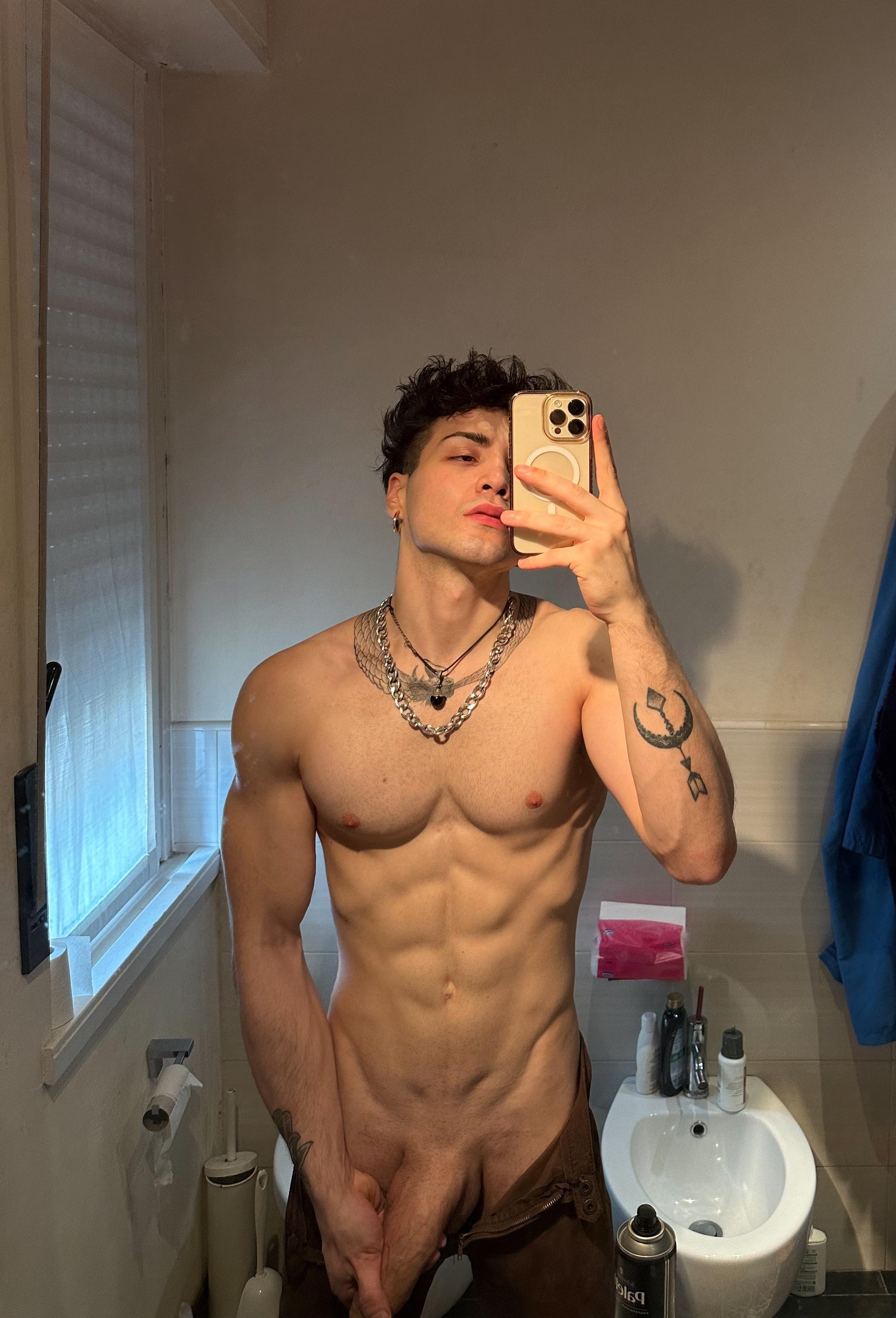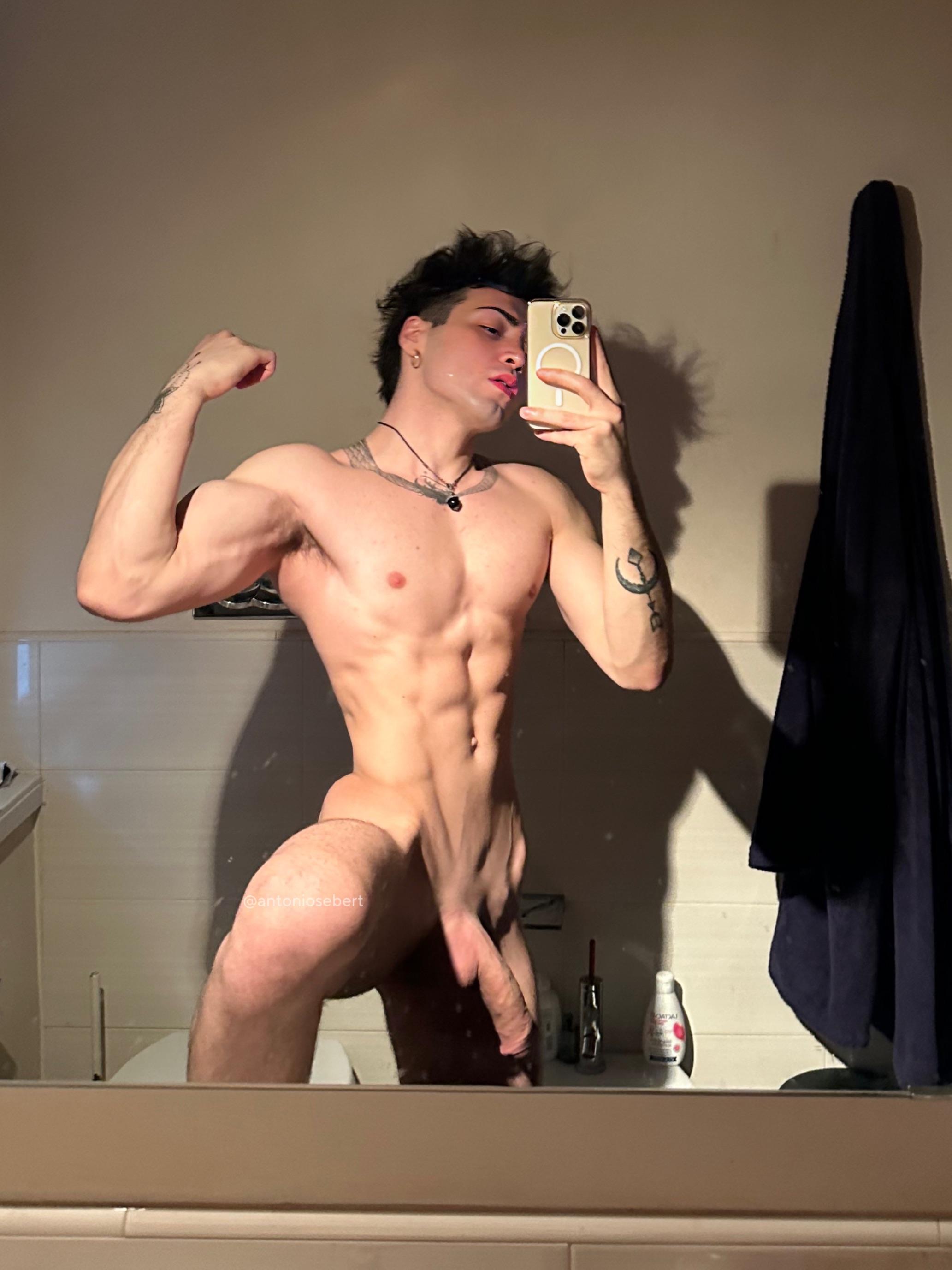 Antonio italiano mostra un cazzo enorme non circonciso: spesso, lungo, venoso, con prepuzio abbondante che scivola indietro lentamente. Lo impugna con orgoglio, pronto a farti impazzire di desiderio.