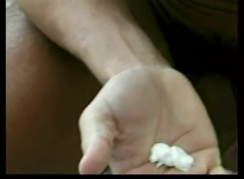 Uomo porco si rilassa masturbandosi il grosso strumento gay con le mani e sborrandosi poi addosso.