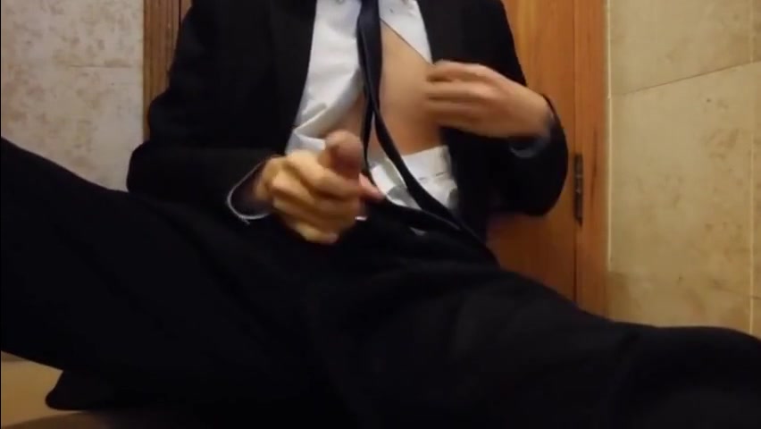 Studente in abito elegante, dopo essersi liberato dei calzoni, si masturba il bel cazzo seduto finché schizza copiosamente