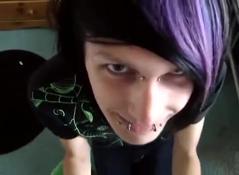 Ragazzo con piercing sulle labbra e sulla lingua succhia il cazzo lungo dell'amichetto attivo fino a farsi riempire la faccia di sborra.