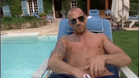Coppia di omosessuali benestanti si rilassano sul bordo della piscina della loro villa godendo con la bocca, il culo ed i loro cazzi turgidi.